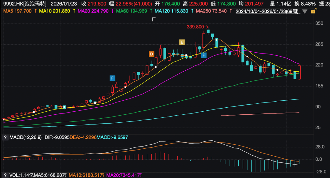 在连续下跌4个月之后,泡泡玛特本周迎来强势反弹。1月19日至23日,泡泡玛特股价上涨近23%,总市值回升至2946亿港元。