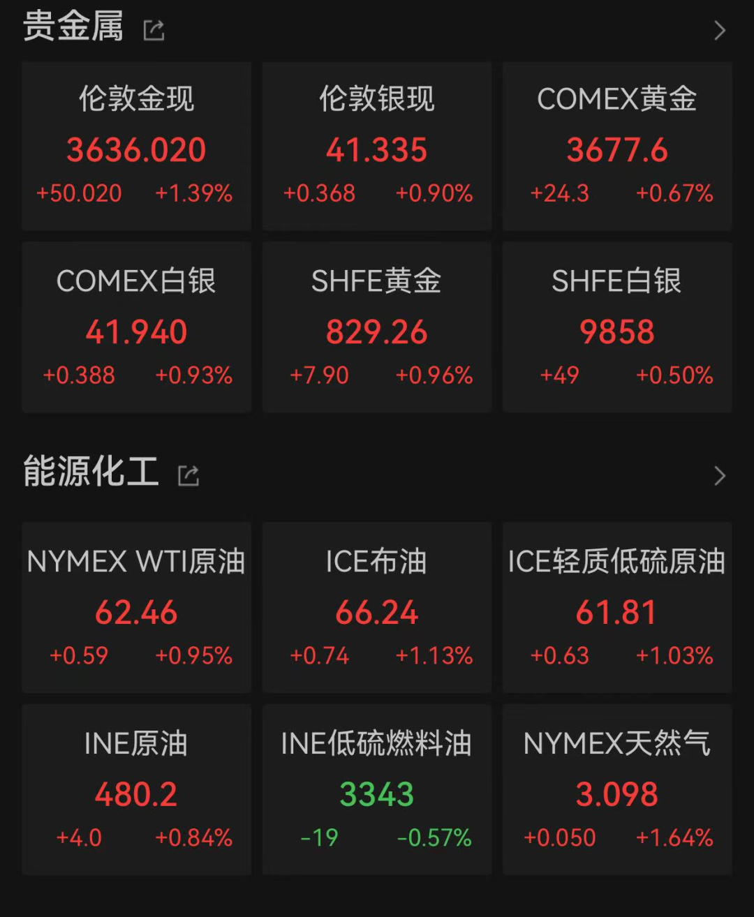 当地时间9月8日,截至收盘,伦敦现货黄金上涨1.39%,报3636.020美元/盎司;COMEX黄金期货上涨0.67%,报3677.6美元/盎司。伦敦现货白银上涨0.90%,COMEX白银期货上涨0.93%。