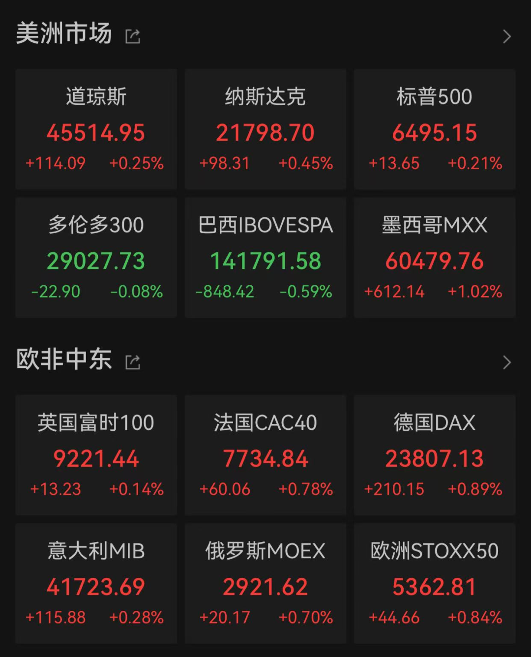 美股三大指数全线上涨,截至收盘,道琼斯工业指数、纳斯达克指数、标普500指数分别上涨0.25%、0.45%、0.21%。