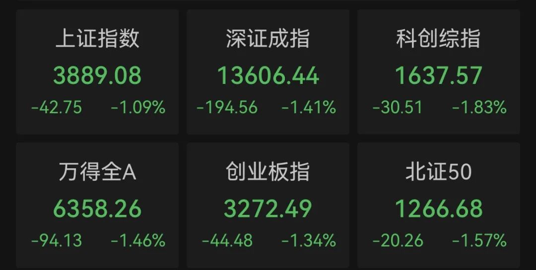 截至收盘,上证指数下跌1.09%,失守3900点,深证成指下跌1.41%,创业板指下跌1.34%,科创综指下跌1.83%。