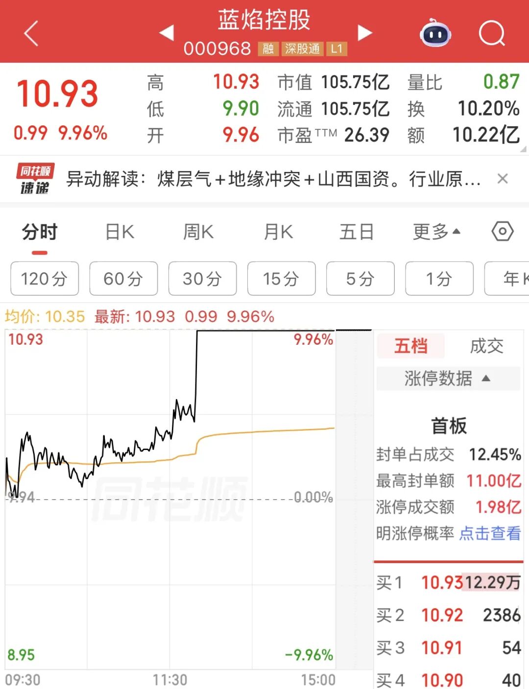 截至收盘,蓝焰控股报10.93元/股,最新市值为105.75亿元,涨停板上封单超12万手。今年以来,蓝焰控股累计涨幅达65.36%。