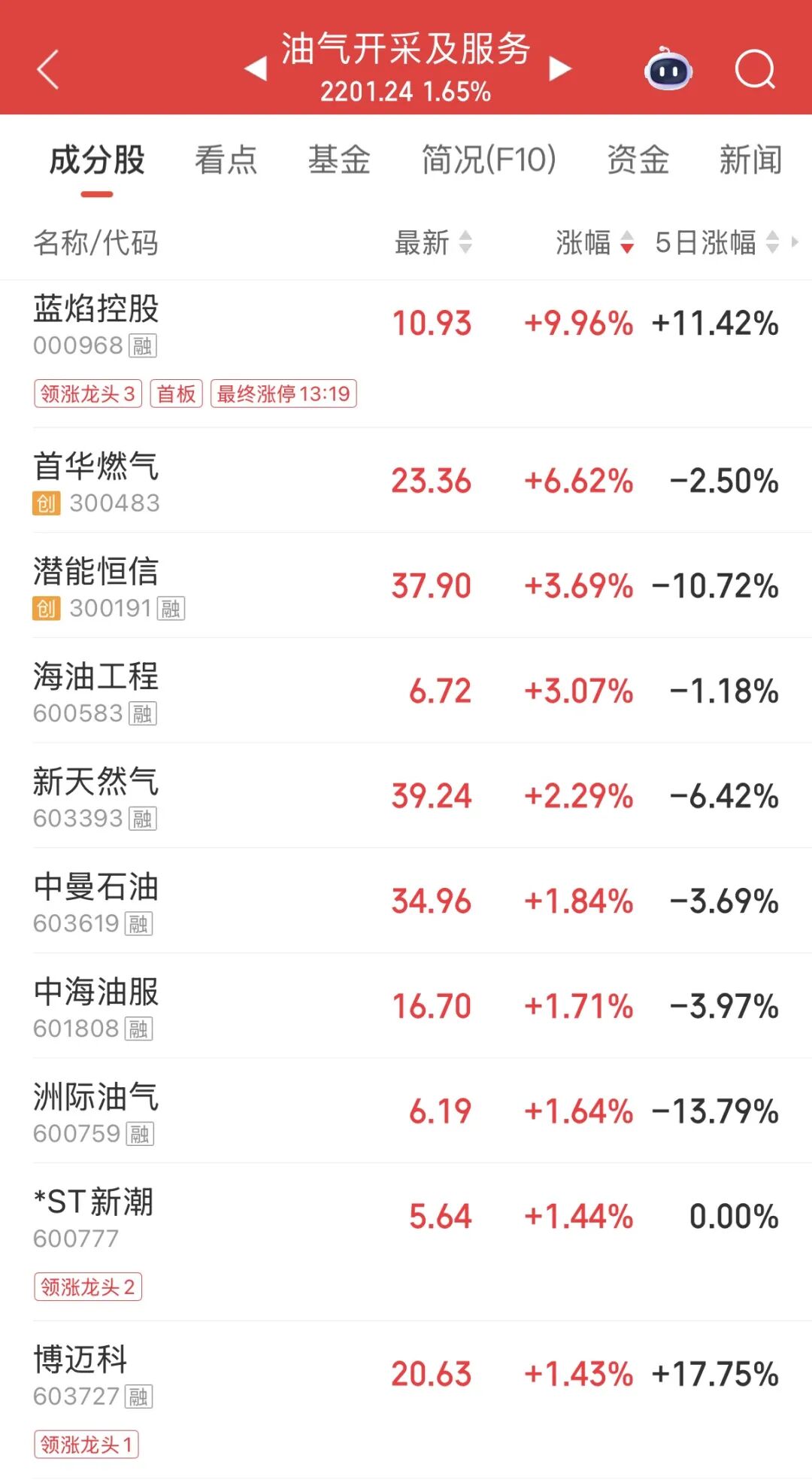受国际油价上涨影响,午后,油气股再度走强。龙头股蓝焰控股直线拉升涨停,首华燃气涨超6%。