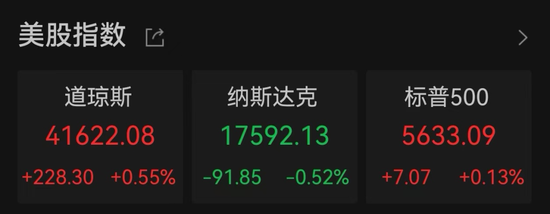 当地时间9月16日,美股三大股指涨跌不一,其中标普500指数连续6个交易日上涨,再度冲击7月创出的历史新高。Wind数据显示,截至收盘,道指涨0.55%,报41622.08点,创历史新高;标普500指数涨0.13%,报5633.09点;纳指跌0.52%,报17592.13点。