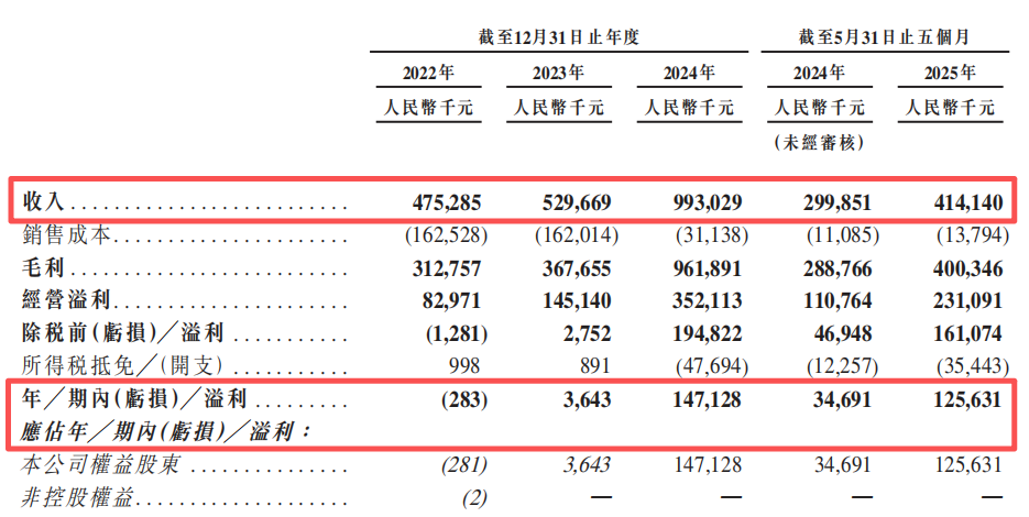 2022年、2023年、2024年以及2025年前5个月,公司收入分别为4.75亿元、5.3亿元、9.93亿元及4.14亿元;净利润分别约为-28.3万元、364.3万元、1.47亿元和1.26亿元。公司的收入主要来自于向业务伙伴提供撮合服务,以及在很小程度上来自广告投放。