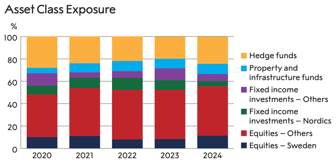 数据还显示,截至2024年底,若不含直接持有的不动产,诺贝尔基金会的投资市值为66亿克朗,包括:56%权益型基金,9%不动产与基础设施基金,12%固定收益资产及现金,24%另类资产,以及-1%的货币对冲损益。2024年的投资回报率为11.6%;过去五年的年化投资回报率为9.2%;过去十年的年化投资回报率为8.3%。