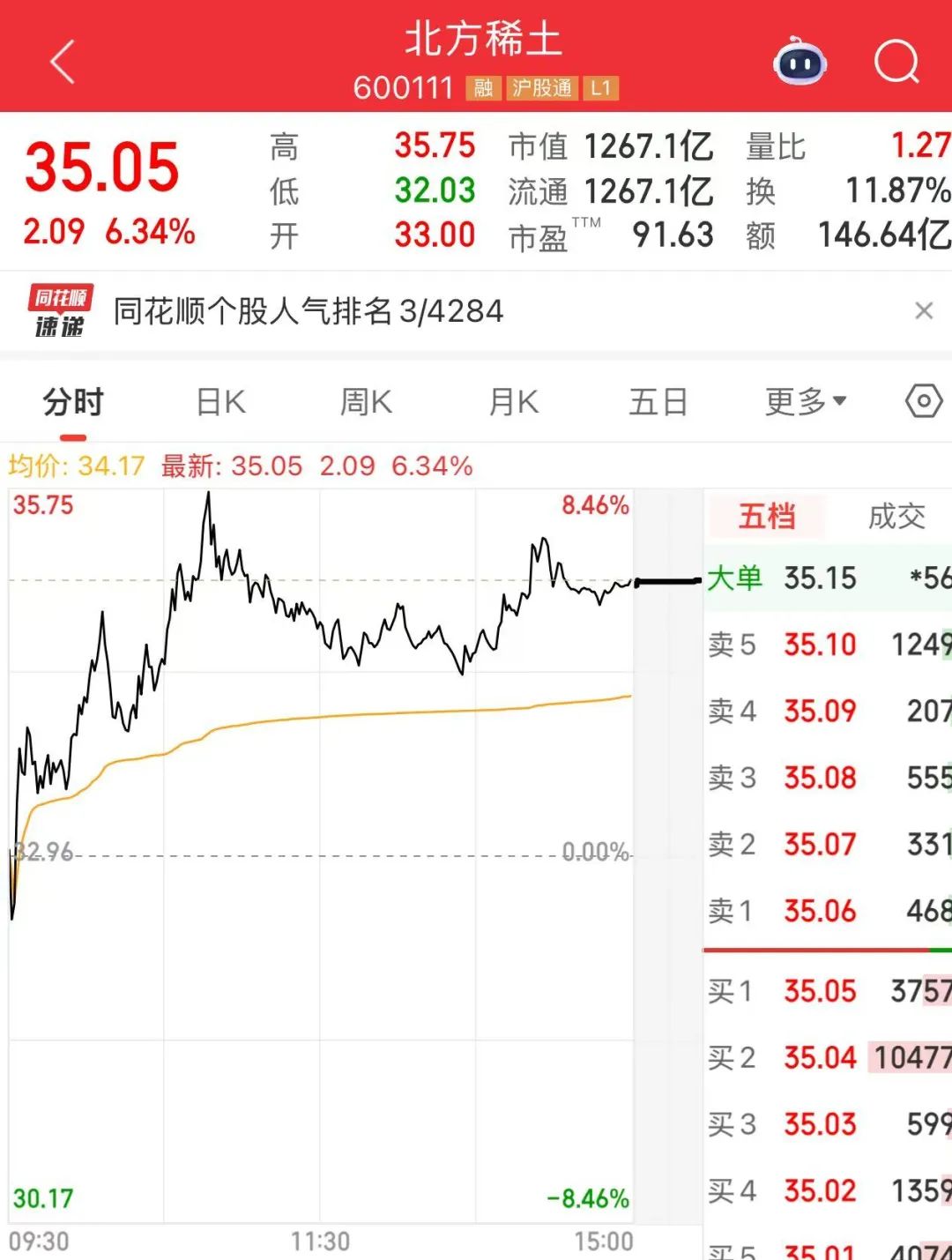 截至今日收盘,北方稀土上涨6.34%,报35.05元/股,成交额为146.64亿元,总市值为1267.1亿元。