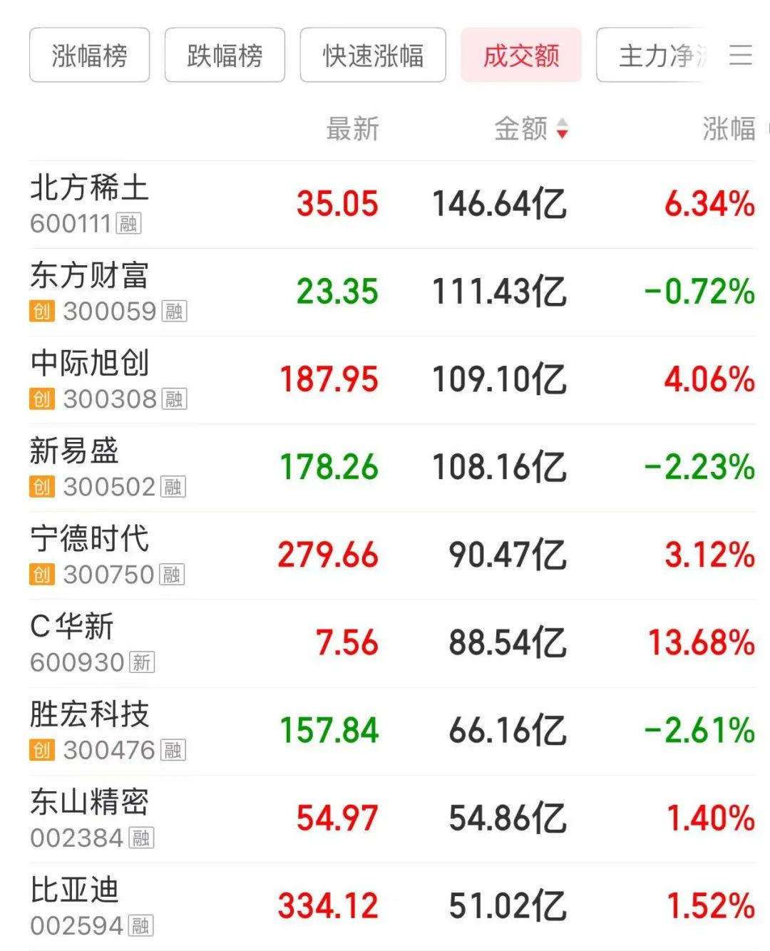 今日盘中,北方稀土(600111)股价一度达到35.75元/股,创下历史新高。截至收盘,该股成交额为146.64亿元,位列A股成交额榜首。今日尾盘,东方财富、中际旭创、新易盛成交额也突破了100亿元。