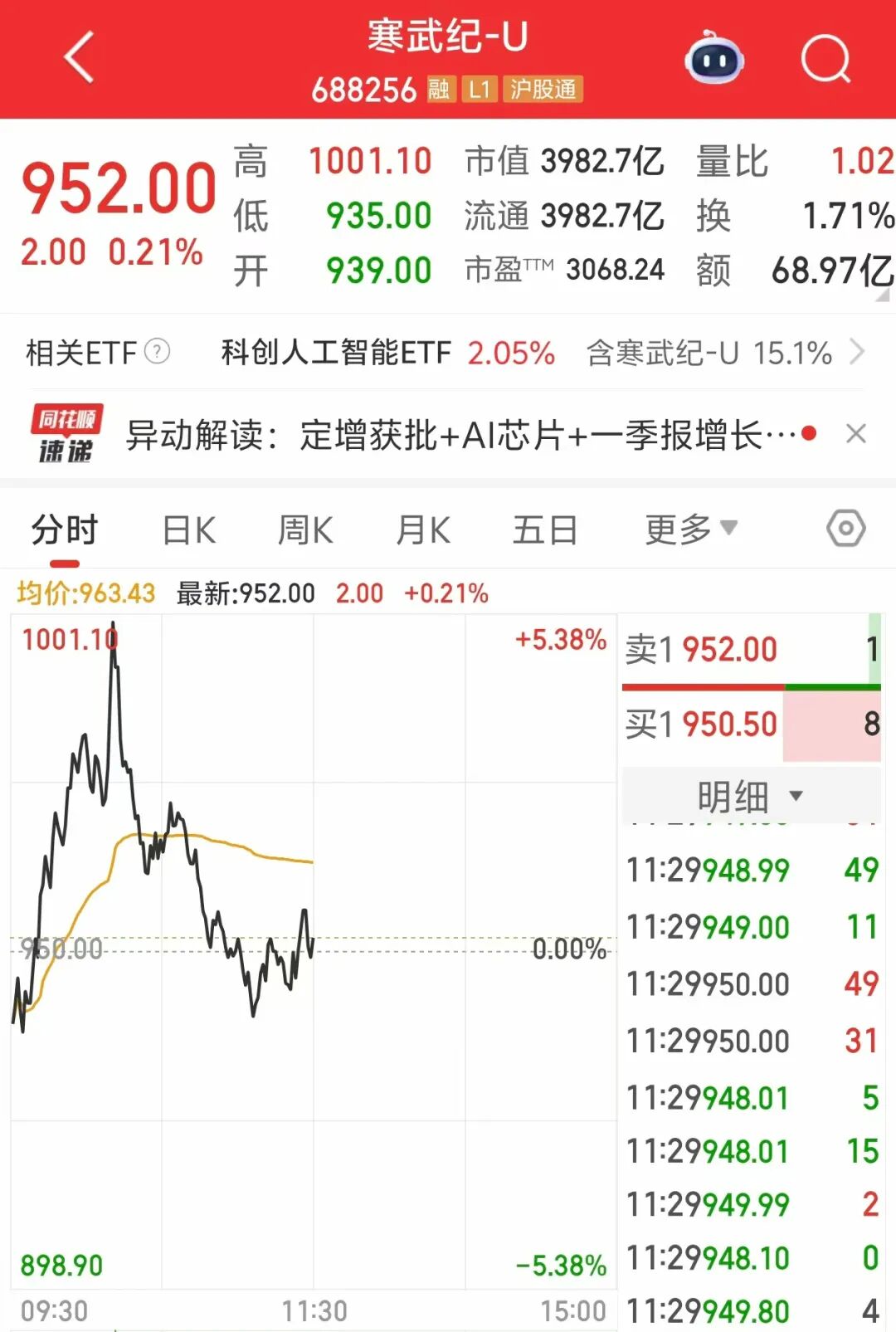一是寒武纪股价能否突破千元大关。这个今天上午盘中实现了,寒武纪盘中股价最高涨至1001.1元,之后有所回落,截至上午收盘,报952元/股。