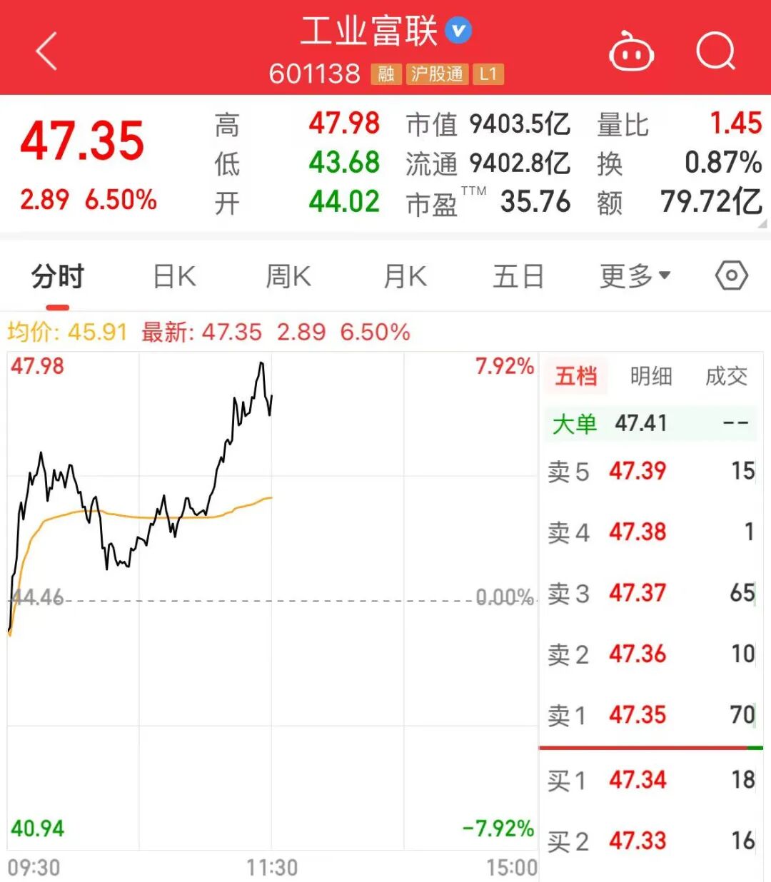 二是工业富联总市值能否破万亿元。今天上午,工业富联上涨6.5%,股价再创历史新高,最新市值为9403.5亿元,居A股第14位。