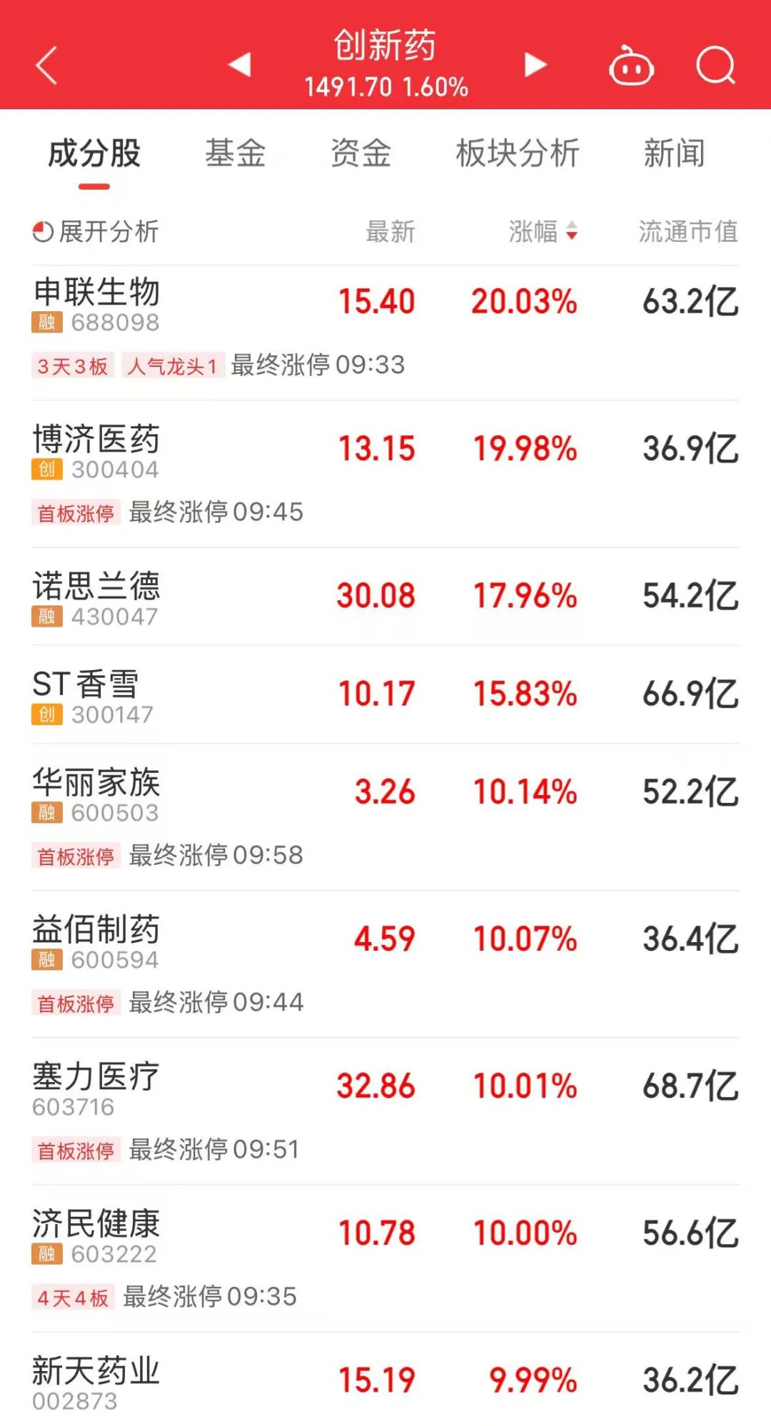 今天上午,医药股全面走强,申联生物、博济医药等个股大涨。