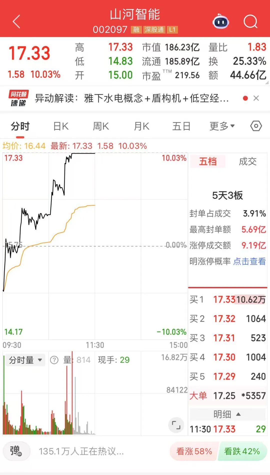 今天上午,水电概念股反弹,山河智能(002097)涨停,实现15天9板,上午成交额为44.66亿元。