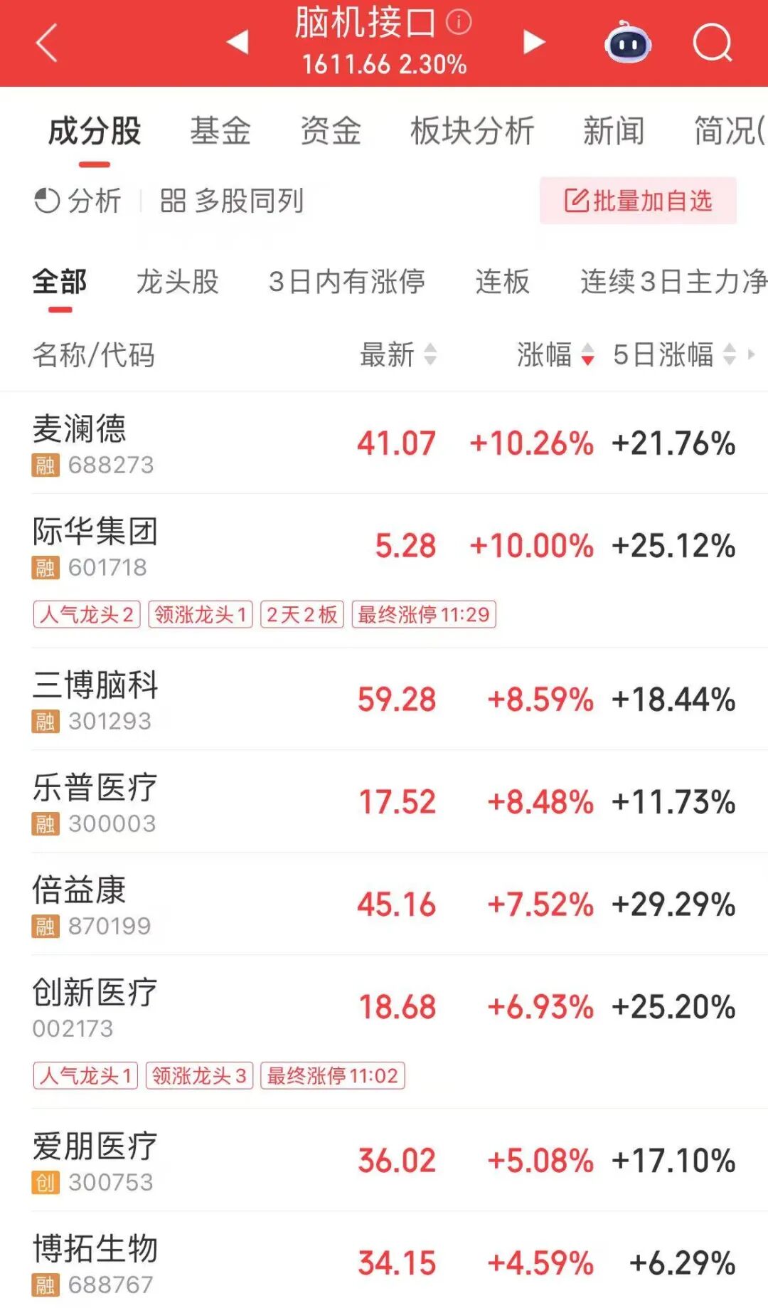 今天上午,脑机接口概念股走强,际华集团涨停。