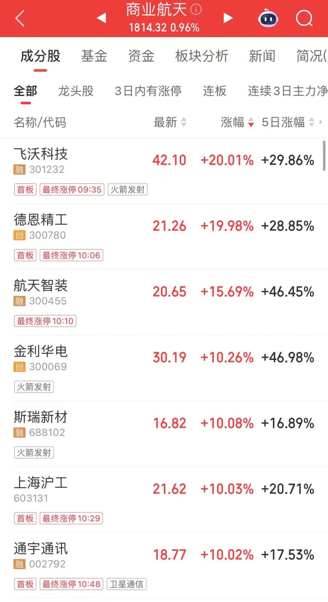 今天上午,商业航天概念延续强势,飞沃科技等多股涨停。