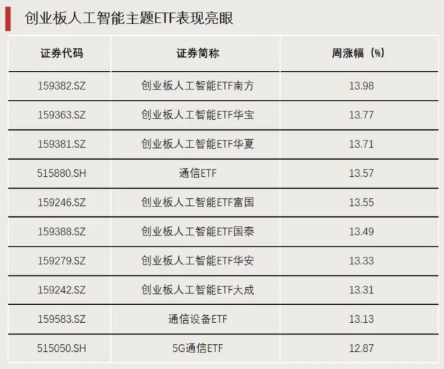 创业板人工智能主题ETF表现亮眼。上周涨幅前十ETF中,有7只产品挂钩创业板人工智能指数,涨幅全部超过13%。通信主题ETF涨幅同样居前,3只相关产品跻身涨幅前十。