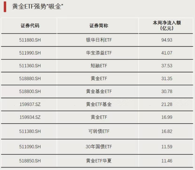 上周,货基、债基、黄金ETF等ETF“吸金”势头较盛。其中,周净流入额前十ETF中,黄金ETF占半数。