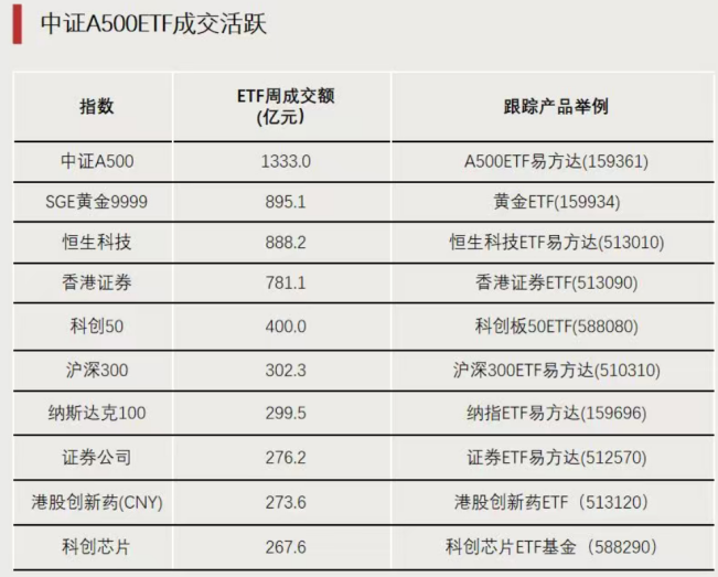 按照成交额汇总口径(剔除货基和债基),上周中证A500指数旗下ETF成交活跃度居市场首位,周成交额超过1300亿元。其中,5只单品周成交额超过百亿元。以A500ETF易方达(159361)为例,该基金上周成交额约176亿元,并获得2.85亿元资金净流入。