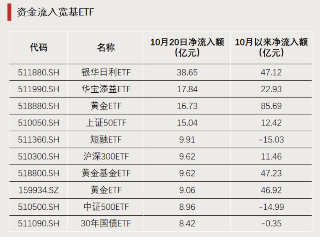10月20日,部分宽基ETF获资金加码,多只黄金ETF继续“吸金”。