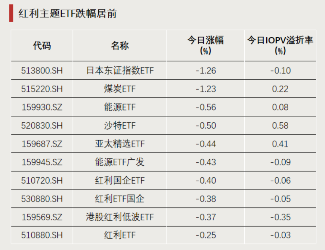 下跌方面,部分红利资产回调,煤炭股普跌,多只红利主题ETF跌幅居前。日本东证指数ETF(513800)、沙特ETF(520830)等跨境ETF也跌幅居前。