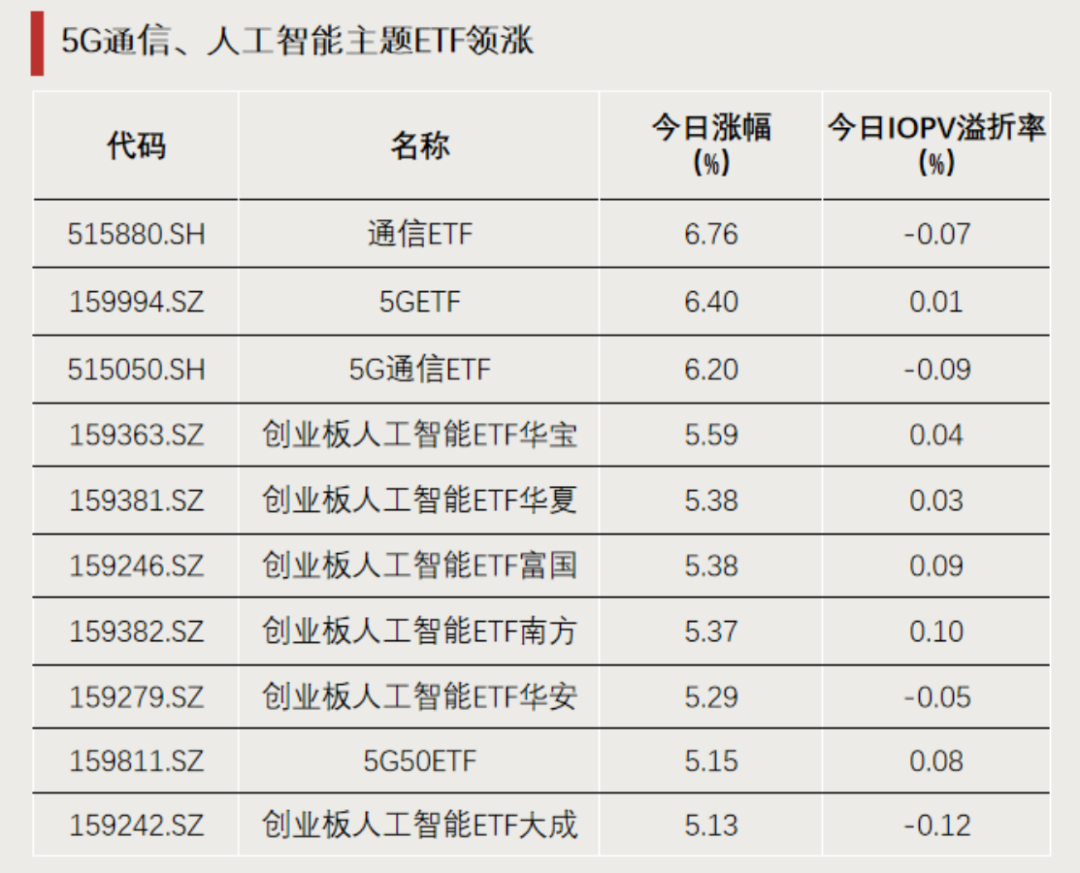 10月21日,A股市场震荡反弹,5G通信、人工智能等主题ETF领涨,多只相关ETF涨逾5%。