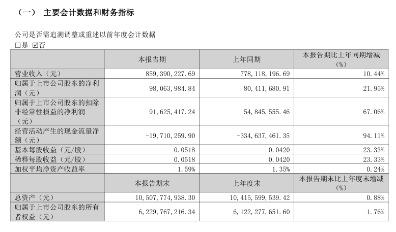 2025年一季度,公司共实现营业收入约8.59亿元,同比增长10.44%;实现归属于上市公司股东的净利润约9806.4万元,同比增长21.95%。