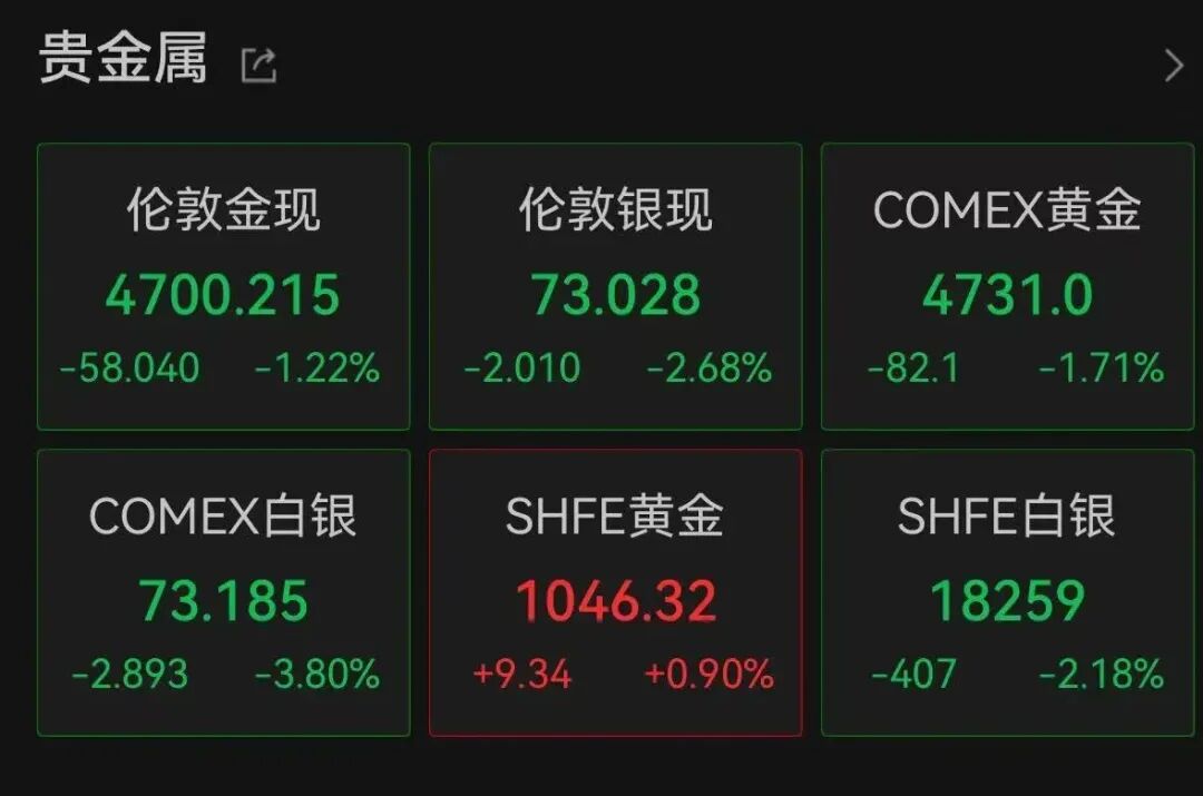 黄金价格跳水。Wind数据显示,截至北京时间9:40,伦敦金现跌1.22%,报4700.215美元/盎司;COMEX黄金期货下跌1.71%,报4731美元/盎司;伦敦银现下跌2.68%,报73.028美元/盎司;COMEX白银期货下探3.8%,报73.185美元/盎司。