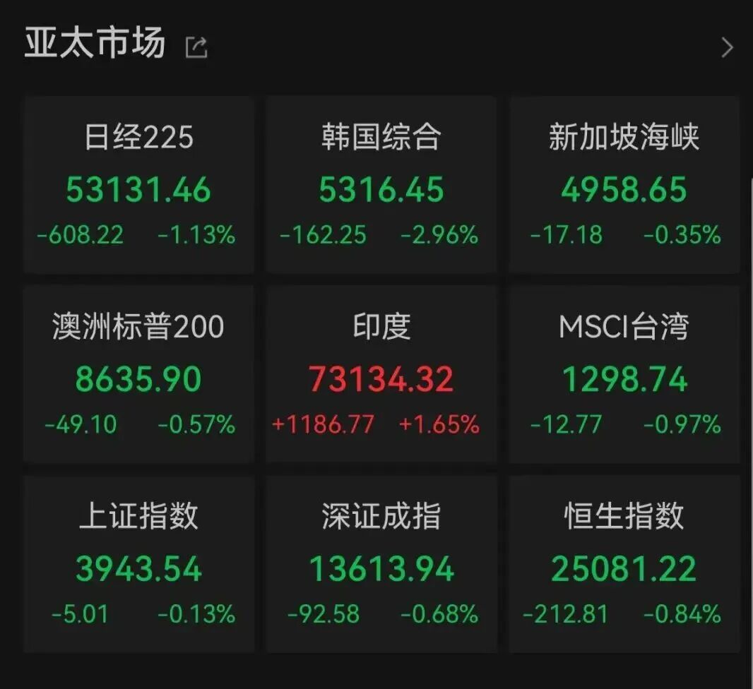 亚太股市集体走弱。Wind数据显示,截至北京时间9:53,韩国综合指数跌2.96%,报5316.45点;日经225指数跌1.13%,报53131.46点。