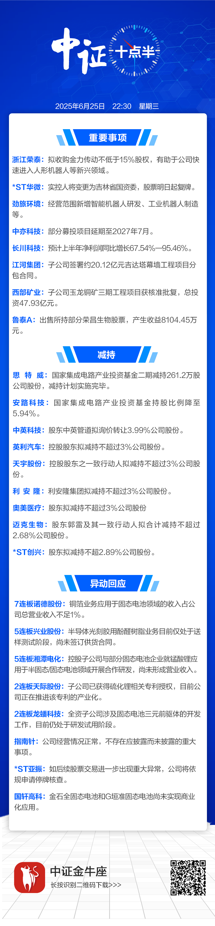 【中证十点半】浙江荣泰将进入人形机器人等领域;多家公司回应固态电池业务情况