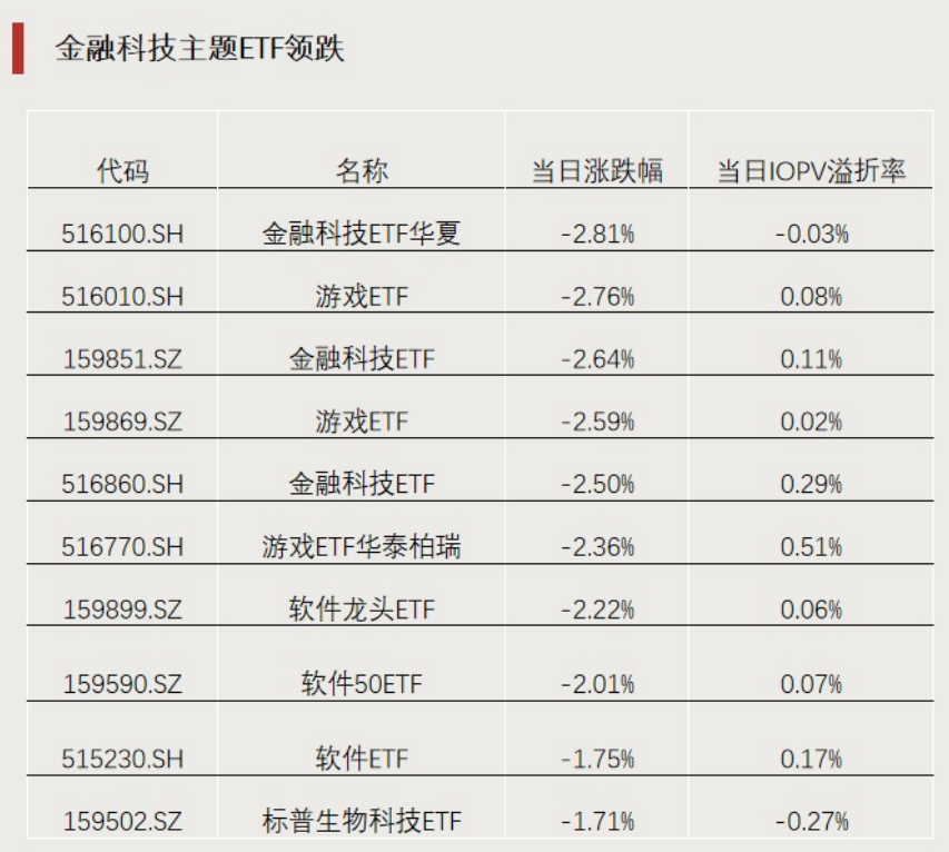 金融科技、游戏、软件等主题ETF跌幅居前,多只跌逾2%。