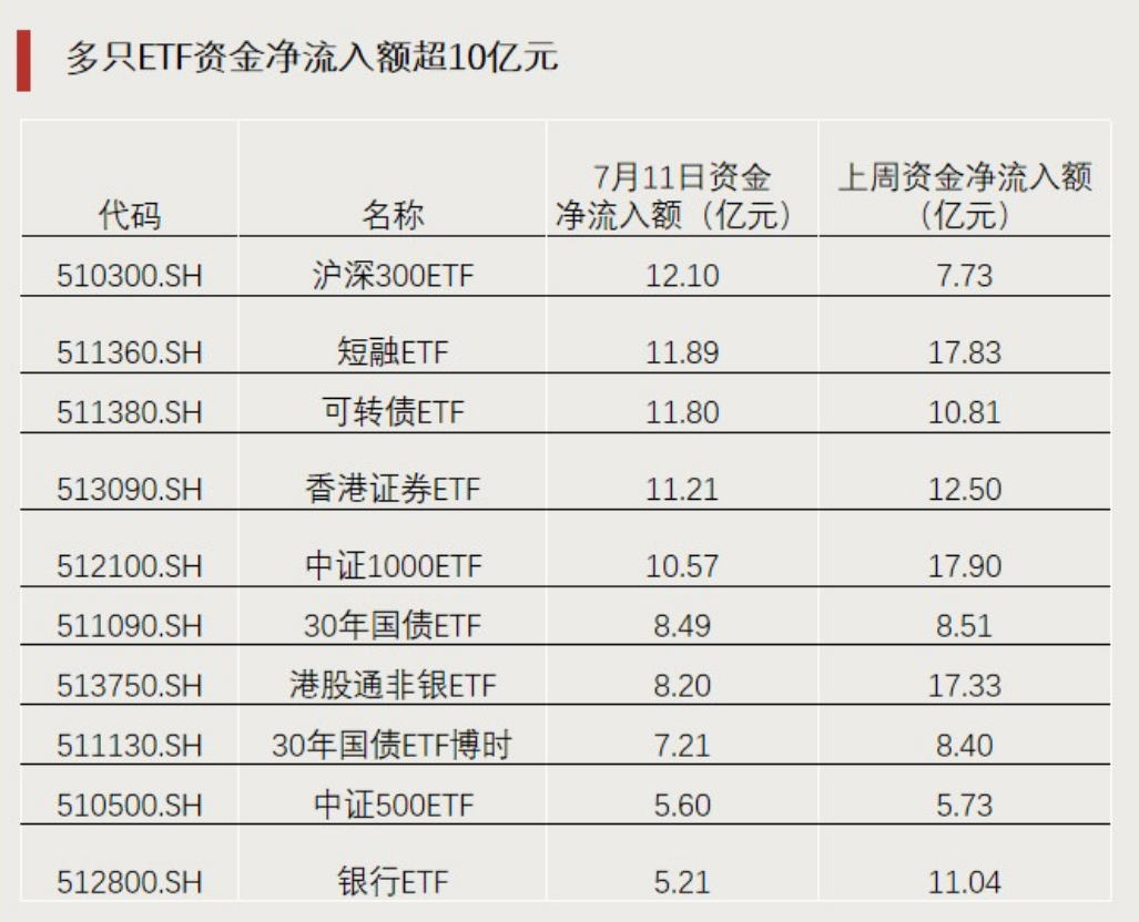 资金流向方面,前一交易日(7月11日),全市场ETF共获105.33亿元资金净流入。其中,沪深300ETF(510300)、短融ETF(511360)、可转债ETF(511380)、香港证券ETF(513090)、中证1000ETF(512100)资金净流入额均超10亿元。