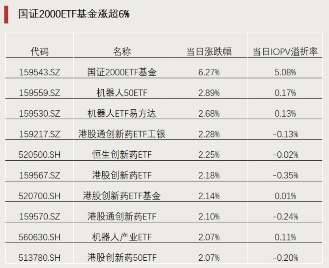 7月14日,国证2000ETF基金(159543)上涨6.27%,领涨全市场ETF,溢价率为5.08%。