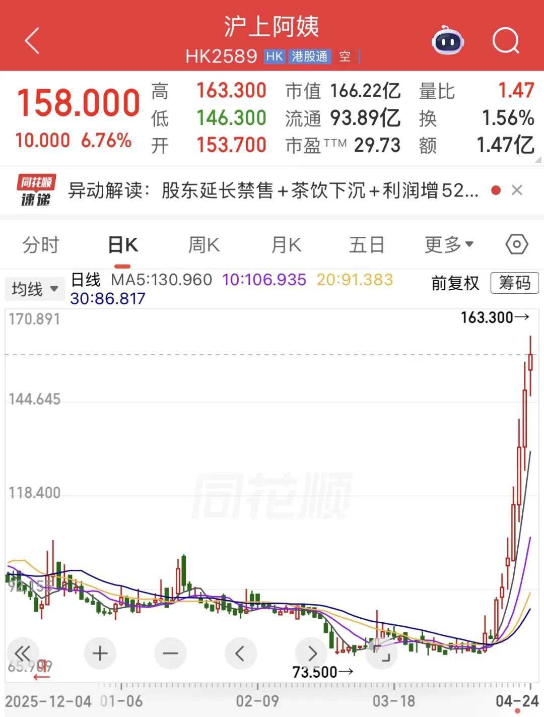 消息面上,沪上阿姨近期宣布,控股股东阵营在原禁售期基础上延长6个月至11月7日,其他首发前股东延长3个月至8月7日。公告称,禁售期延长表明前述股东对该公司的未来前景及长期价值充满信心,且不排除基于业务发展情况进一步延长。