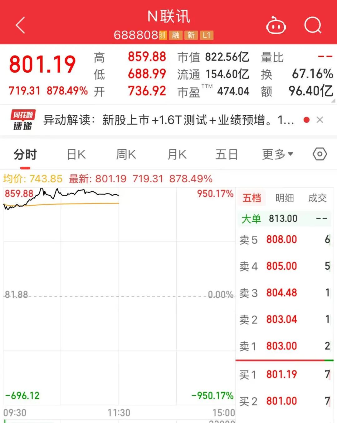 算力产业链中也有亮点。今天上市的新股联讯仪器,上午大涨878.49%,盘中最高价为859.88元,与81.88元的发行价相比,中一签最高盈利达38.9万元。