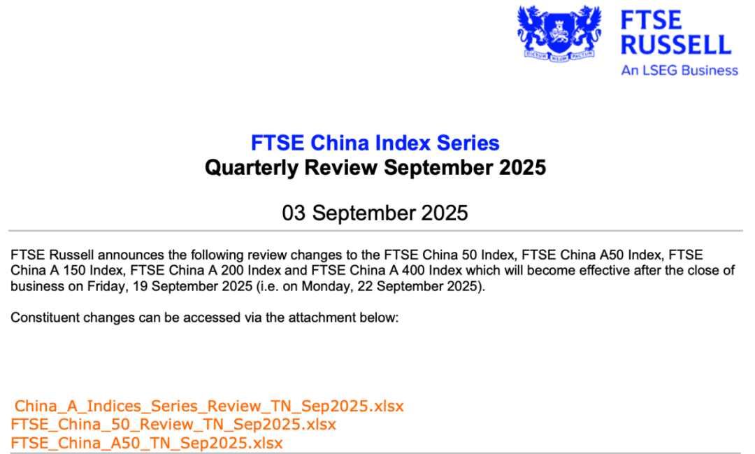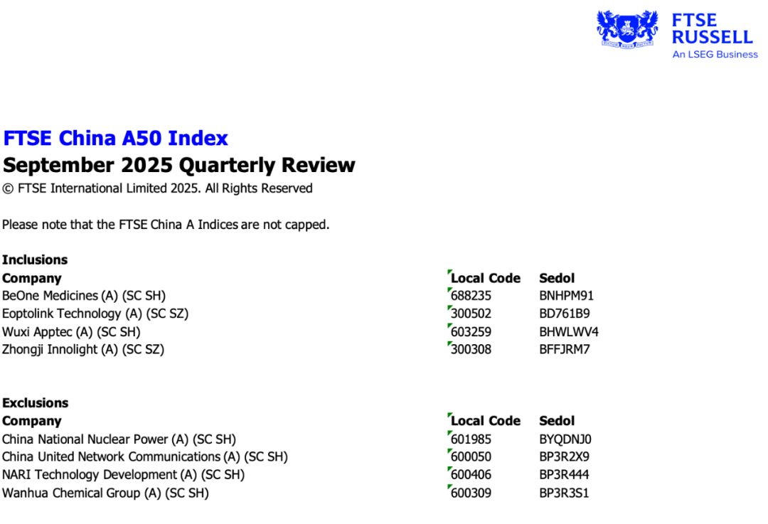9月3日,富时罗素宣布对富时中国50指数、富时中国A50指数、富时中国A150指数、富时中国A200指数、富时中国A400指数的审核变更。其中,最受市场关注的富时中国A50指数,本次纳入百济神州-U、新易盛、药明康德、中际旭创,同时剔除中国核电、中国联通、国电南瑞、万华化学。