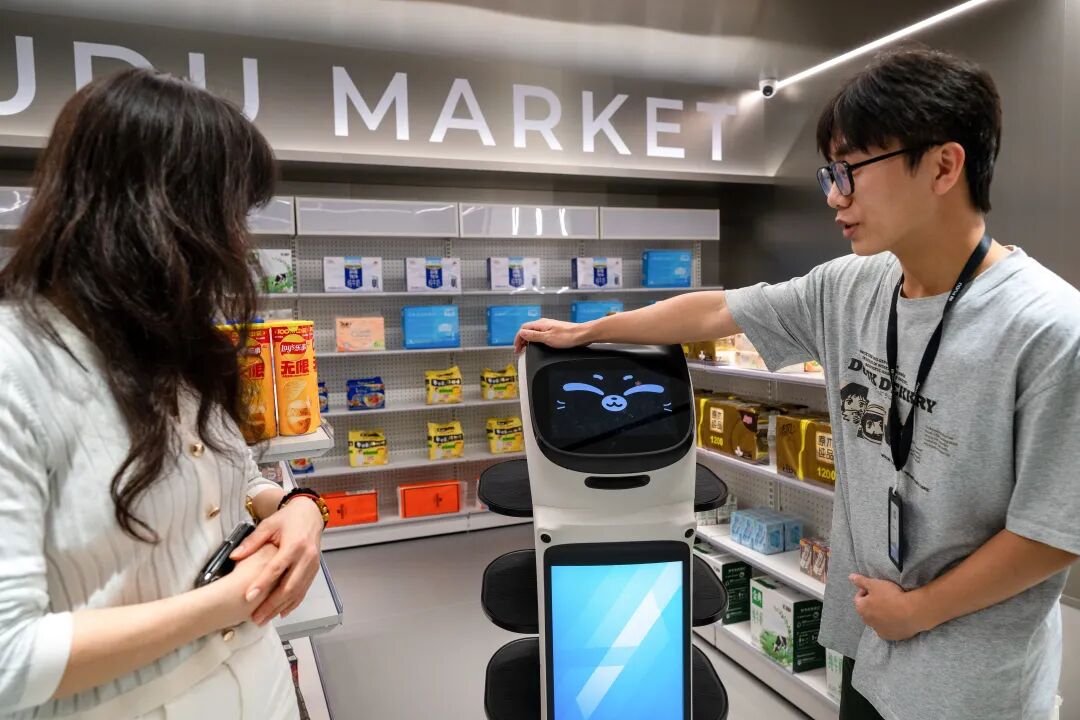 普渡科技工作人员在和猫形配送机器人贝拉pro互动。新华社记者 刘梦琪 摄