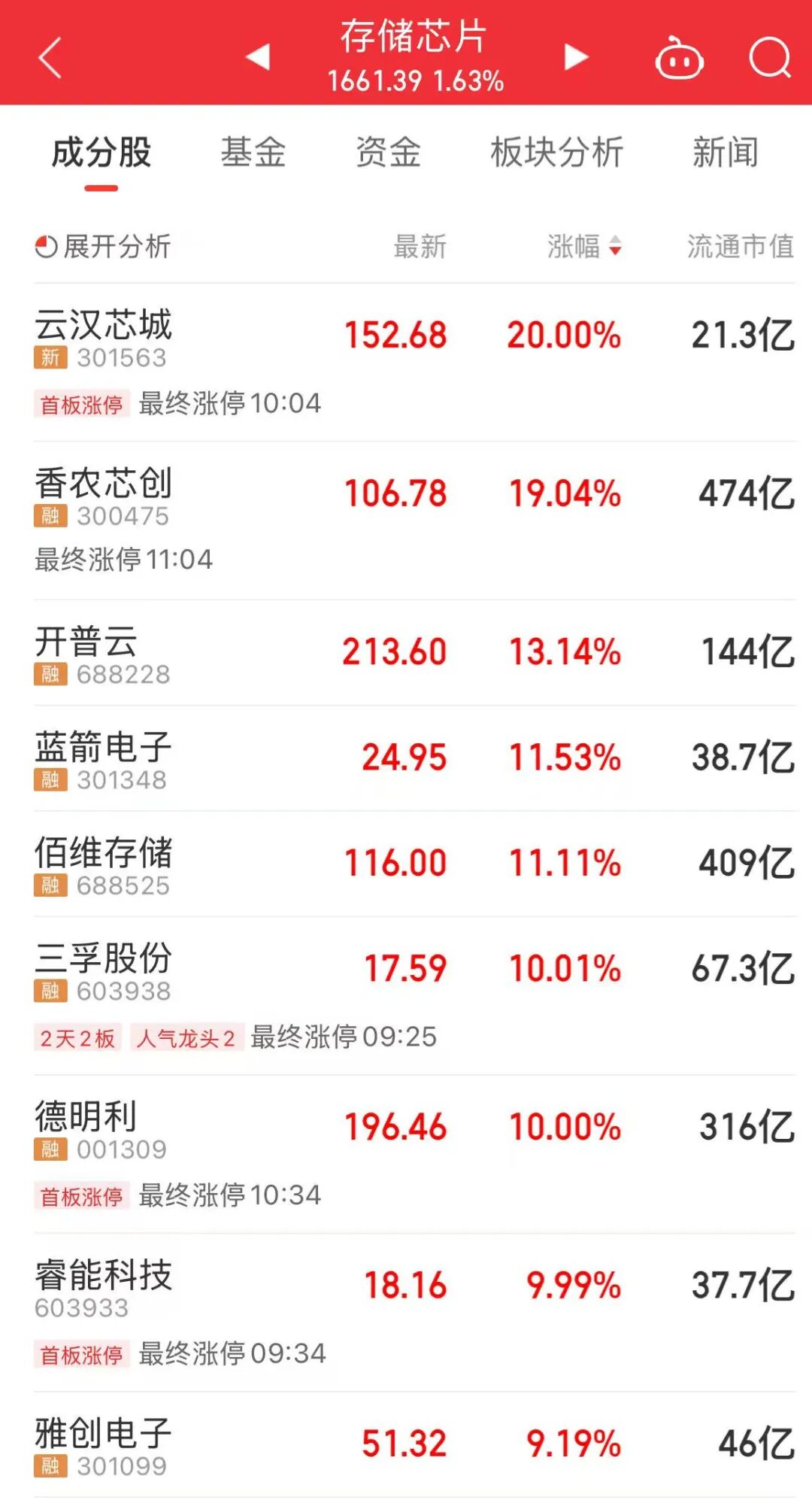 今天上午,存储芯片板块上涨,香农芯创涨超19%,德明利、三孚股份涨停。