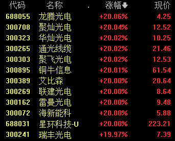 盘面上,AI算力需求催化科技股行情。光学光电子、Micro LED概念板块全天表现强势,“光电”股刷屏A股涨幅榜,聚飞光电、聚灿光电、雷曼光电、瑞丰光电等20余股涨停。