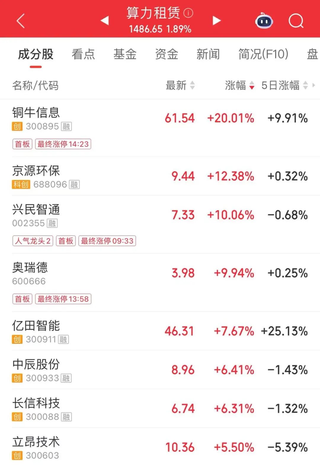 算力产业链反弹,新易盛、中际旭创等光模块龙头股表现亮眼,成交额分别达280亿元、214亿元,居A股成交额前两名。算力租赁板块午后异动拉升,铜牛信息直线冲高,“20CM”涨停,奥瑞德涨停。