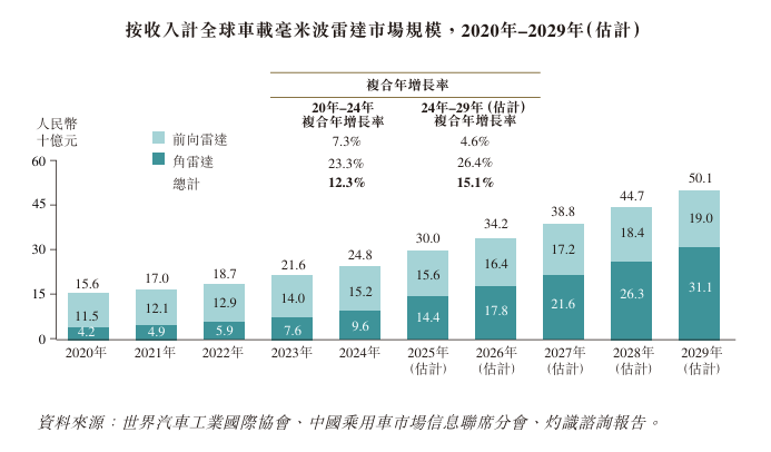 在智能驾驶行业高速增长的背景下,车规级毫米波雷达行业迎来增长黄金期。全球汽车毫米波雷达市场规模从2020年的156亿元增长至2024年的248亿元,复合年增长率达12.3%。市场预计,到2029年市场规模将达501亿元,复合年增长率为15.1%。