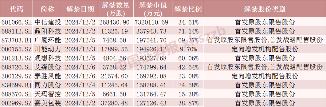 具体来看,中信建投12月2日将解禁26.84亿股,均为首发原股东限售股份。鼎阳科技12月2日将解禁1.13亿股,均为首发原股东限售股份。广厦环能12月5日将解禁7468.50万股,为首发原股东限售股份和首发战略配售股份。