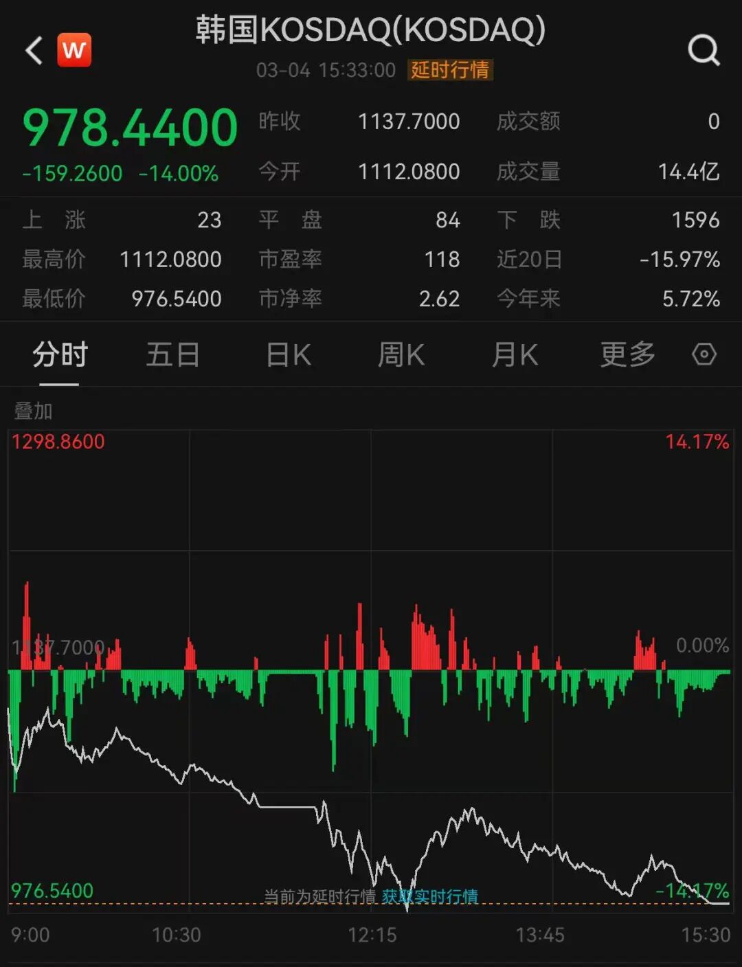 3月4日,韩国股市再度暴跌。截至收盘,韩国综合指数下跌12.06%,报5093.54点。韩国KOSDAQ指数下跌14%,报978.44点。