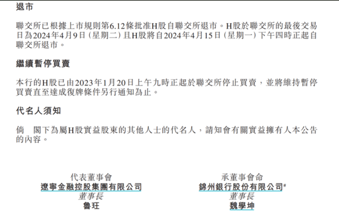 “联交所已根据上市规则批准H股自联交所退市。H股于联交所的最后交易日为2024年4月9日且H股将自2024年4月15日下午四时起自联交所退市。”4月12日,锦州银行及要约人辽宁金融控股集团有限公司的联合公告披露了上述安排。该公告显示,截至4月12日下午4时,已接获约35.15亿股H股的H股要约的有效接纳,分别占公告日独立H股股东所持H股、已发行H股及全部已发行股份约99.93%、99.93%及25.14%。内资股方面,该公告披露,截至4月12日下午4时,已接获约14.87亿股内资股的内资股要约的有效接纳,分别占公告日独立内资股股东所持内资股、已发行内资股及全部已发行股份约59.09%、14.21%及10.64%。2024年3月18日,国家金融监督管理总局网站显示,国家金融监督管理总局辽宁监管局同意辽宁金融控股集团有限公司收购锦州银行股份,收购股份数不超过60.34亿股。收购后,辽宁金融控股集团有限公司持股比例不超过49.81%。批复显示,锦州银行应进一步强化股东股权和关联交易管理,完善公司治理,加强风险管理和内部控制,防范和化解风险。应严格遵照有关法律法规完成上述变更股权事宜,并在完成后1个月内报告。辽宁金融控股集团有限公司(简称“金控集团”)官网显示,该公司于2019年12月注册成立,是辽宁省财政厅100%持股的省属国有金融企业,注册资本金200亿元。2023年末,集团合并口径资产总额超过6400亿元。官网显示,金控集团作为省属唯一的金融资源整合平台,业务覆盖银行、证券、基金、担保、不良资产经营、企业征信、金融科技等多个板块,有效发挥金控集团整合区域金融资源、助力维护全省金融安全、促进地方经济发展的职能作用。锦州银行成立于1997年1月22日,总部位于辽宁省锦州市,于2015年12月7日在香港联合交易所主板挂牌上市。锦州银行官网显示,截至2022年6月30日,该行资产总额为8265.52亿元。在各级党委政府、监管部门的领导支持下,锦州银行实施改革重组,引入成方汇达、辽宁金控、工银投资、信达投资、长城资产5家机构投资入股。2024年3月28日,锦州银行发布公告称,由于该行重大财务重组相关交易尚待确定,该行核数师需要更多资料和时间以完成有关2022年度业绩及2023年中期业绩的审核程序,锦州银行将进一步延迟刊发2022年度业绩及2023中期业绩。