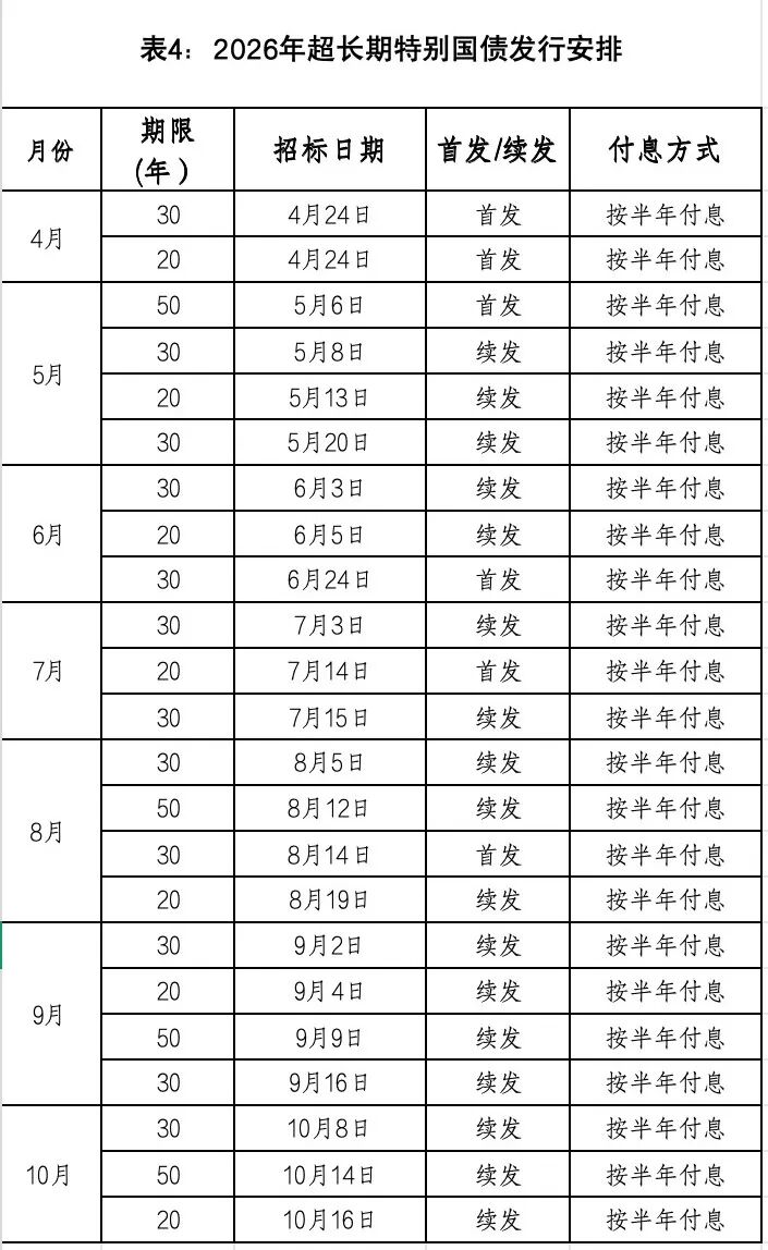 根据财政部公布的发行安排,2026年超长期特别国债集中在4月至10月发行,总共将发行7只20年期、12只30年期、4只50年期超长期特别国债,共计23只,30年期国债较去年实际发行量多1只。