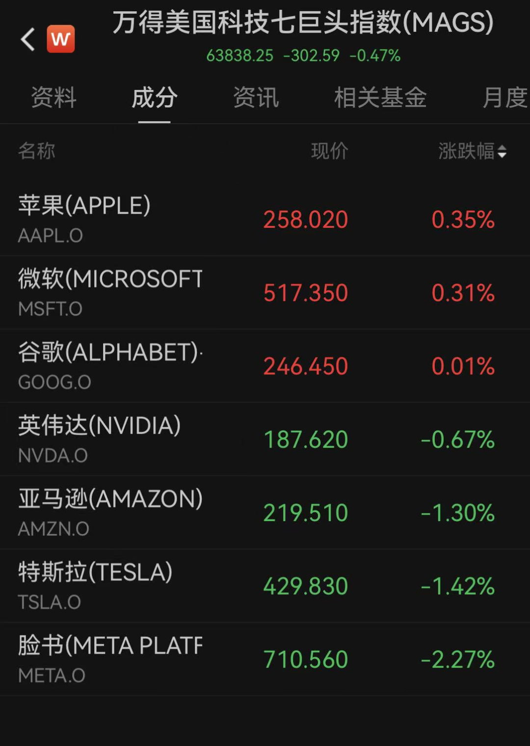 大型科技股涨跌不一,万得美国科技七巨头指数下跌0.47%。苹果上涨0.35%,微软上涨0.31%,谷歌-C上涨0.01%,英伟达下跌0.67%,亚马逊下跌1.30%,特斯拉下跌1.42%,META下跌2.27%。