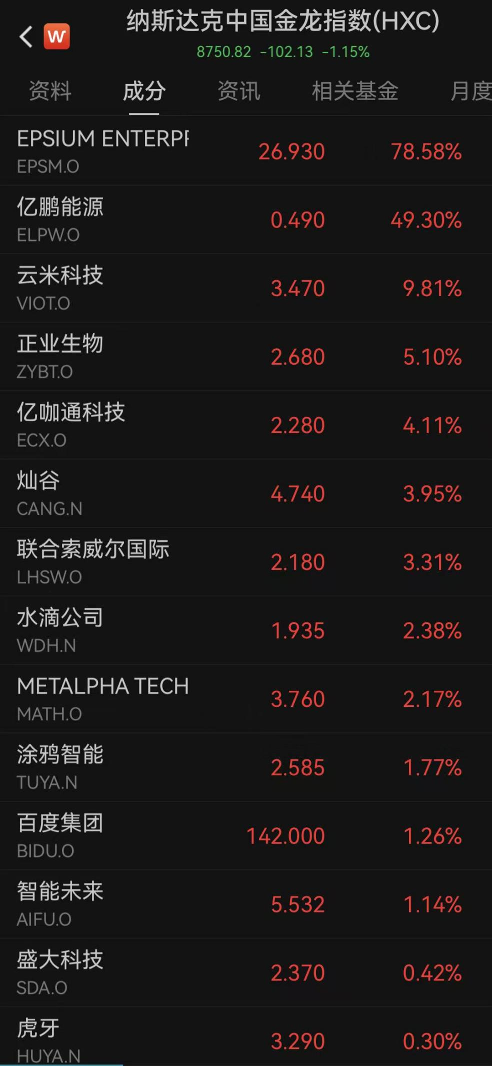 热门中概股涨跌不一,纳斯达克中国金龙指数下跌1.15%。EPSIUM ENTERPRISE涨近80%,亿鹏能源涨近50%,百度集团涨逾1%,腾讯音乐、阿里巴巴、极氪等小幅下跌,蔚来、金山云、新东方等跌逾2%,理想汽车、小鹏汽车等跌逾3%。