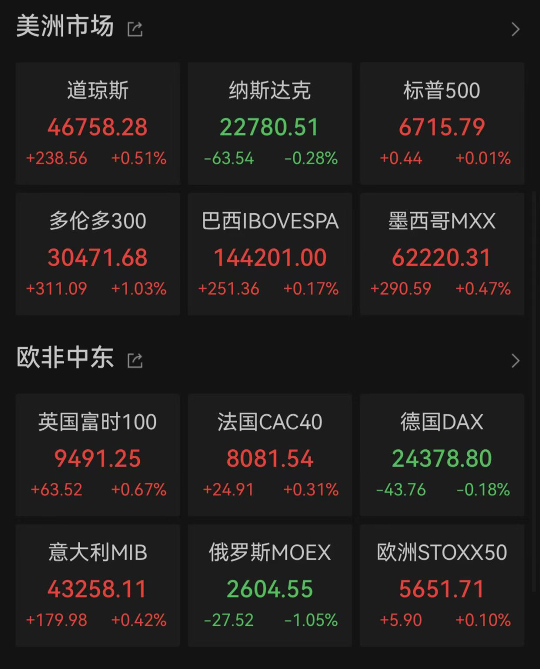 美股三大指数涨跌不一,截至收盘,道琼斯工业指数、标普500指数分别上涨0.51%、0.01%,均创历史新高,纳斯达克指数下跌0.28%。