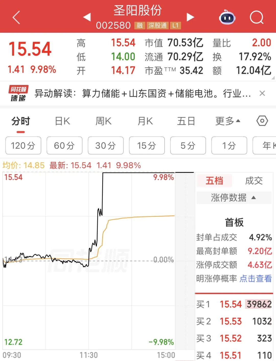 截至收盘,圣阳股份报15.54元/股,最新市值为70.53亿元。