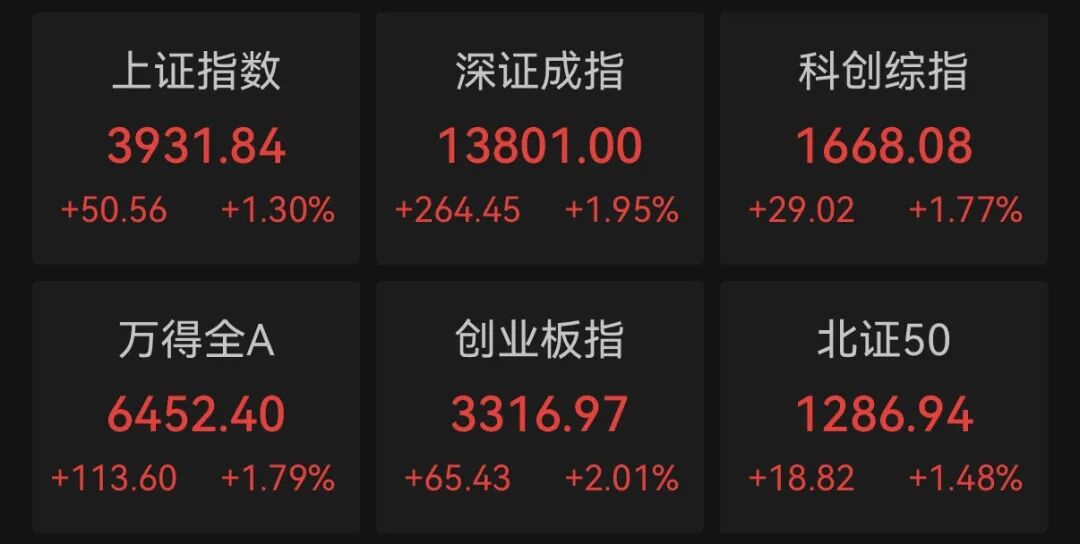 A股市场延续反弹,电力、算力硬件、有色金属概念股持续活跃。截至收盘,上证指数上涨1.30%,深证成指上涨1.95%,创业板指上涨2.01%,科创综指上涨1.77%。