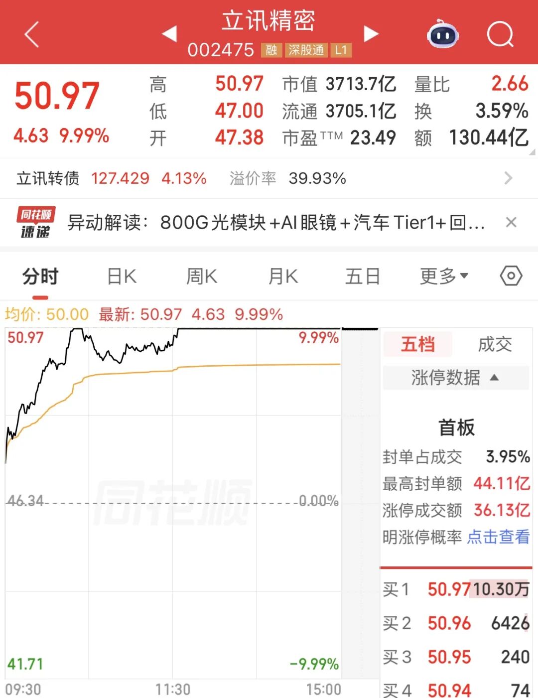 立讯精密午后涨停