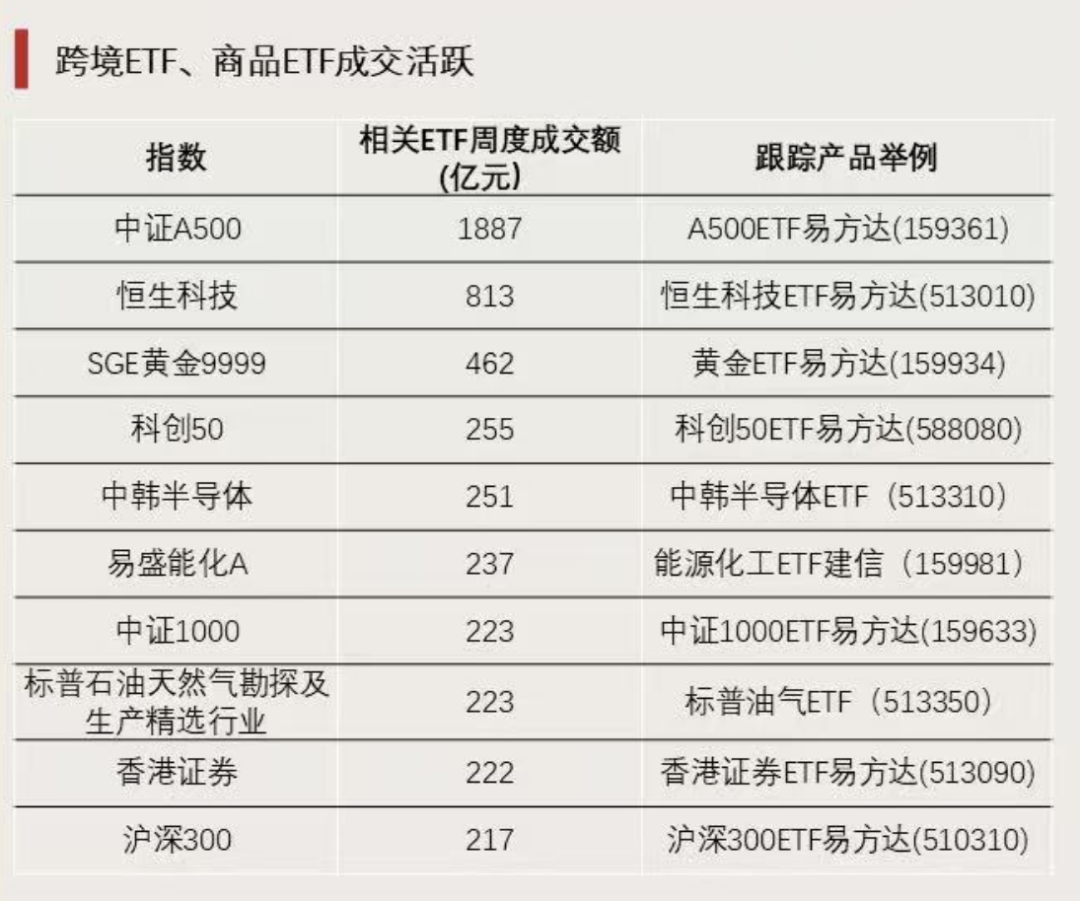 中证A500ETF活跃度持续领跑,A500ETF易方达(159361)成交活跃。此外,跨境型、商品型ETF受关注,黄金ETF易方达(159934)、恒生科技ETF易方达(513010)以及中韩半导体、标普油气、香港证券相关ETF成交活跃。