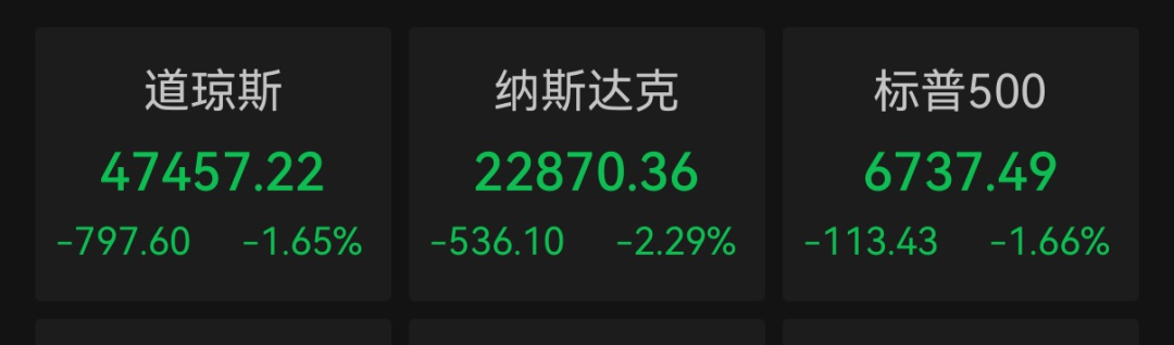 Wind数据显示,截至当日收盘,道琼斯工业平均指数跌1.65%,标准普尔500指数跌1.66%,纳斯达克综合指数跌2.29%。